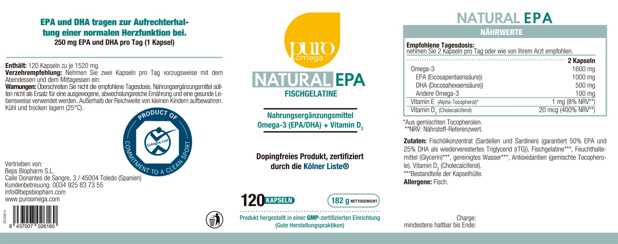 Um Sportlern, Trainern und medizinischem Fachpersonal bei der sichereren Auswahl von Nahrungsergänzungsmitteln zu helfen, nimmt Puro Omega Natural EPA in die Cologne List® auf. Dies garantiert, dass es vollständig frei von anabol-androgenen Steroiden und Stimulanzien ist.
