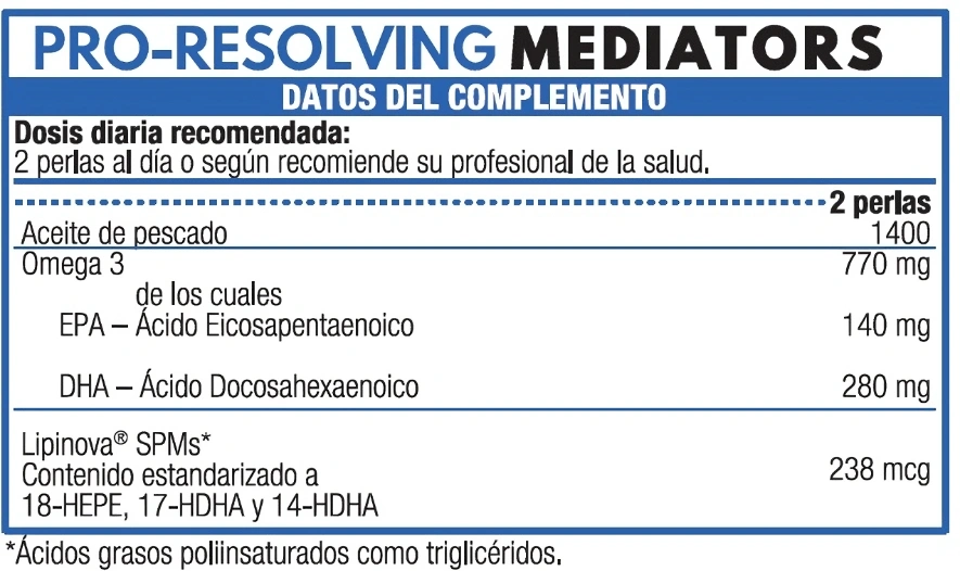 Unsere neue Formel Puro Omega PRO-RESOLVING MEDIATORS enthält eine maximale Konzentration an besonderen Omega-3 Derivaten, bekannt unter der Abkürzung “SPM´s” (= Specialized Pro-Resolving Mediators = entzündungsauflösende Moleküle). Hierzu gehören vor allem die Verbindungen: 18-HEPE, 17-HDHA und 14-HDHA